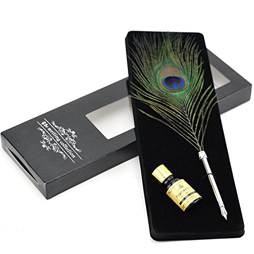 Antique Writing Peacock Quill with ink Feather Pen Set -Dip Feather Pen Calligraphy Pen Set Writing Quill Ink Dip Pen For Harry Potter Fans (Peacock Pen) (Green)