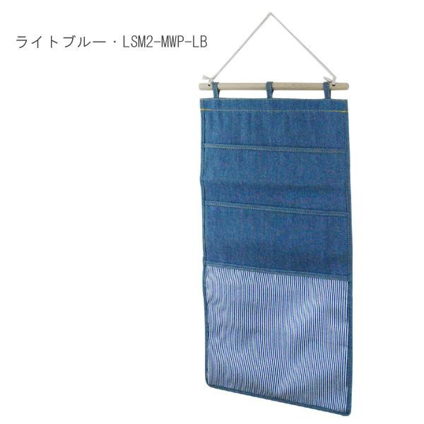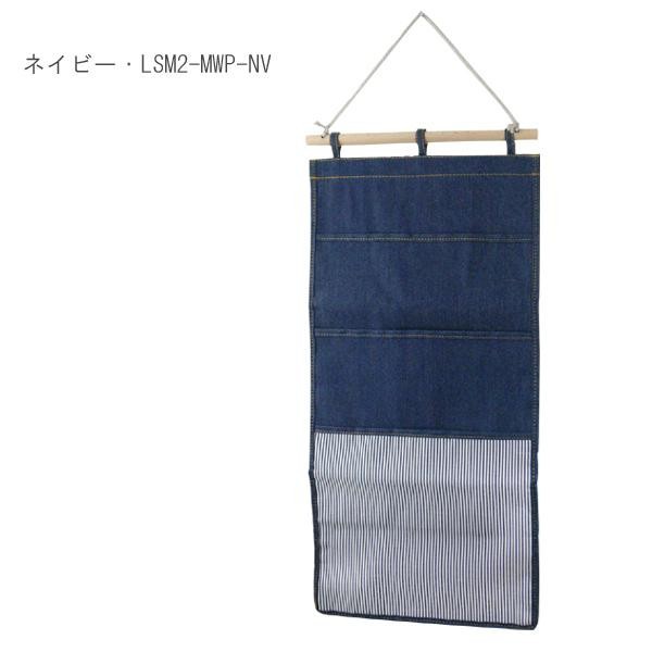 | デニム素材のオシャレなウォールポケットです。木棒を使用しているので安定して物を出し入れできます。A4サイズの雑誌、ノートやファイルが収納可能です。フェイクゴールドの色糸を使用した縫い目がポイントです。ポケットは3段。1番下のポケットがストライプ柄になっています。 |