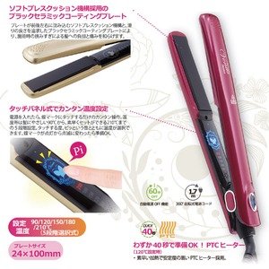 플레이트가 전후좌우에 가라앉아 붐비는 소프트 프레스 쿠션 기구와,미끄러짐이 좋은 블랙 세라믹 코팅 플레이트에 의해시술시의 사이에 둬 지나가게 밤발에의 부담이 손상을 부드럽게 합니다.재빠른 가열로 안정 도의 높은PTC히터를 채용하고, 바쁜 아침 그렇지만,전원을 넣고부터 불과 40초에 준비OK.온도대는,머리카락에 친절한 90℃부터,소 빨리세트이 생기는 210℃까지,나비 마크로 터치 할 때마다 5단계의 설정 온도로 완전히 바뀝니다.60 분자동 전원OFF기능 타이머 첨부이므로 안심 안전.하드한 움직임에 대응 할 수 있는360도 회전 코드.여행으로도 편리한 해외 대응타입입니다.