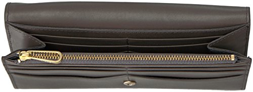The snap-button flap of the continental leather flap wallet opens to reveal 12 credit card slots, a zip pocket and a bill slot, while the exterior features a back slip pocket large enough for a smartphone.