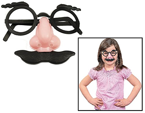 -. Brand : Fun Express -. Color : Black -. Department : unisex-child -. EAN : 0110043475847 -. Feature : A classic disguise, these kid-sized glasses are sure to get some laughs at your next party! / But why do it alone? With 48 classic disguises in every order, the bulk glasses will let you share in the fun. / A fun gag gift for secret spies or comedians, these 4" plastic spectacles are a costume essential. / 12 Pack. / Whether you're looking for some laughs or want to look like Groucho Marx, these glasses include the nose, eyebrows and mustache to make sure you look the part. -. MPN : 5576645 -. PackageQuantity : 6 -. PartNumber : 5576645 -. ProductGroup : Apparel -. ProductTypeName : ADULT_COSTUME -. Size : Child -. Title : Child Nose, Eyebrows and Mustache Glasses (12 Pack) 3 1/2". Plastic.