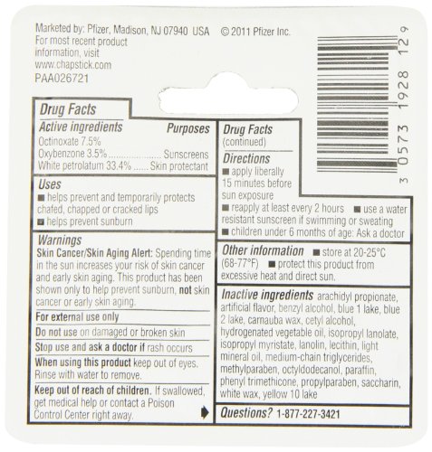 -. Feature : CHAPSTICK LIP BALM / SKIN PROTECTANT/ SUNSCREEN SPF15 / WITH AN ULTRA HYDRATING FORMULA / MOISTURIZER GREEN APPLE FLAVOR / HANGABLE BLIS