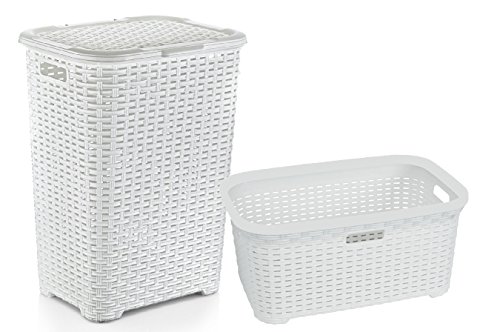-. Feature : High caliber plastic laundry hamper and basket / Hamper 1.70 Bushel 60 Liter - Basket 1.40 Bushel / 50 Liter / Large size holds plenty of laundry / Decorative basket-weave design / Matching trash bins and toilet brushes available
