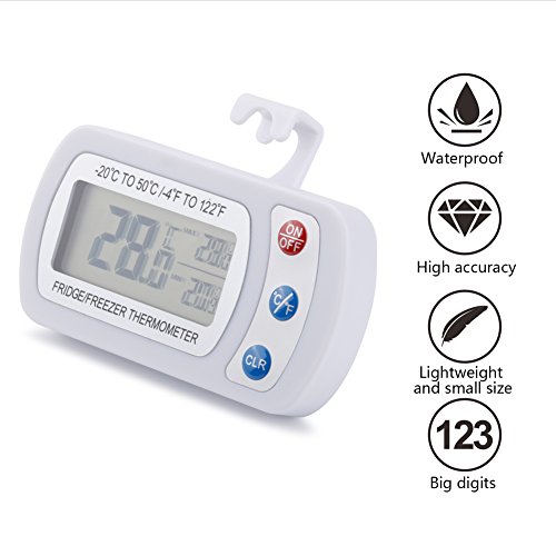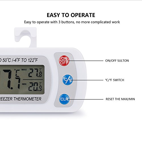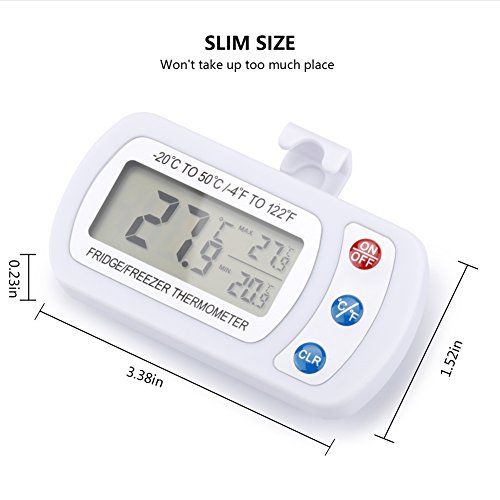 Specification: Dimensions (W*H*D):3 ½" x 1 7/8" x 7/8" Display: Digital Measurement: °C °F Minimum Temperature: -4°F (-20℃) Maximum Temperature: 122°C (50℃) measurement cycles: 10S Net weight: 45g Accuracy: ±1°C / ±2°F, please kindly note ± variation of 2°C or 4°F is within tolerance Button Display: ON / OFF C/F, CLEAR Material: Plastic Battery: 3 Volt Model CR2032 Lithium Battery