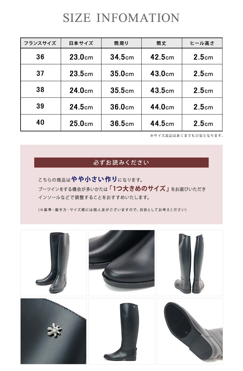 | 仕様 | ●36(23.0cm) 筒周り:約34.5cm(内寸) 足首筒周り:28.7cm 高さ:約42.5cm ヒール2.5cm ●37(23.5cm) 筒周り:約35.0cm(内寸) 足首筒周り:29.6cm 高さ:約43cm ヒール2.5cm ●38(24.0cm) 筒周り:約35.5cm(内寸) 足首筒周り:30.3cm 高さ:約43.5cm ヒール2.5cm ●39(24.5cm) 筒周り:約36.0cm(内寸) 高さ:約44cm ヒール2.5cm 重量:約800g ●40(25.0cm) 筒周り:約36.5cm(内寸) 高さ:約44.5cm ヒール2.5cm 【付属品】なし | ||