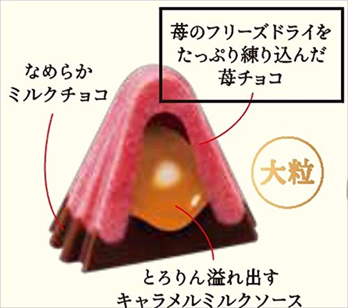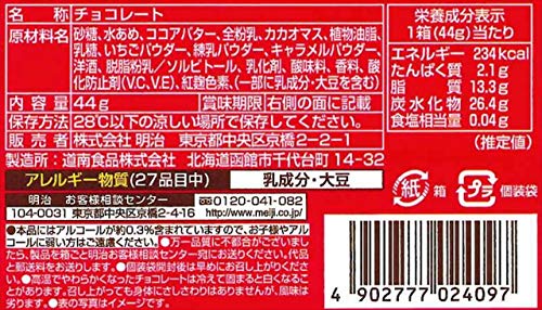 原材料:砂糖、水あめ、ココアバター、全粉乳、カカオマス、植物油脂、乳糖、いちごパウダー、練乳パウダー、キャラメルパウダー、洋酒、脱脂粉乳、ソルビトール、乳化剤、酸味料、香料、酸化防止剤(V.C、V.E)、紅麹色素、(一部に乳成分・大豆を含む)