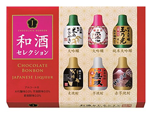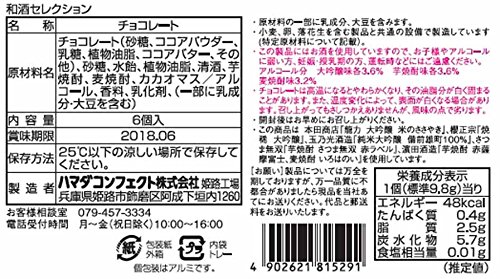 原材料:チョコレート(砂糖、ココアパウダー、乳糖、植物油脂、ココアバター、その他)、砂糖、水飴、清酒、植物油脂、麦焼酎、カカオマス/アルコール、香料、乳化剤、(一部に乳成分・大豆を含む)