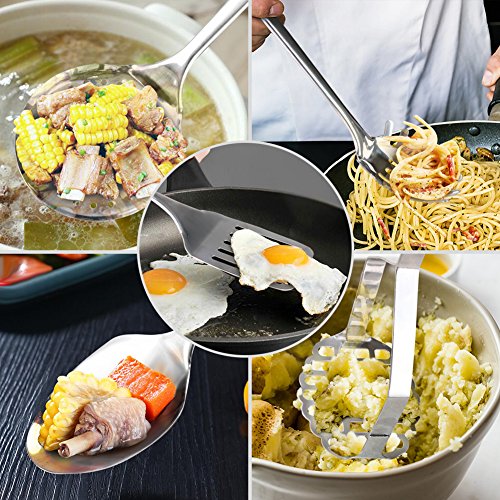 1. 4 pans 1 pot: 1.5 QT covered saucepan, 2.5 QT covered saucepan, 5 QT covered stockpot, 8" fry pan, 9.5" covered saute pan, designed to meet the needs of everyday cooking. 2. 5 cooking utensils: 1 Potato Masher, 1 Solid Spoon, 1 Pasta Fork, 1 Slotted Turner and 1 Skimmer. 3. Mirror polished cookware set blends well with your kitchen and dining room.