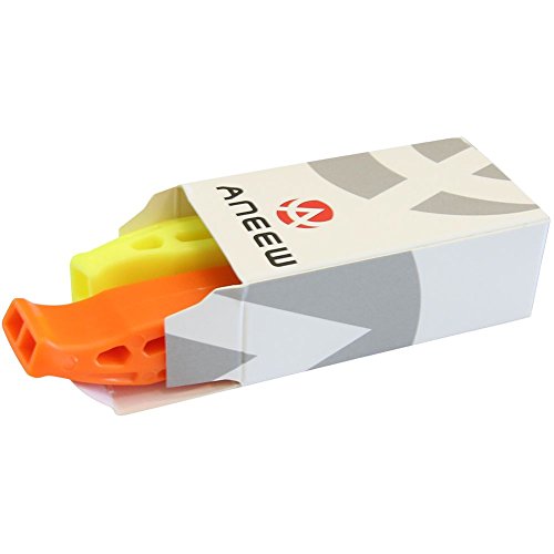 Package includes: 2 safety whistles(Orange+Yellow). Unit whistle size: 2.83 x 0.79 inches. Length of lanyard: 16.5 inches(NOT fit around necks).