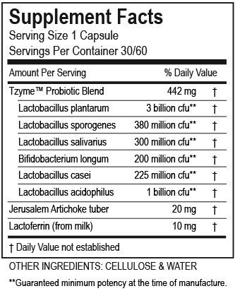 Beneficial bacteria often become imbalanced by poor diet choices and environmental lifestyle stressors. Issues can arise when opportunistic microorganisms feed on undigested food molecules, creating gas. This comprehensive probiotic formula includes six different probiotic sources totaling more than 5 billion colony forming units (c.f.u.) per capsule.** Chosen for their safety and efficacy, the GI stable and heat stable microorganisms mirror the ratios found in a healthy GI tract.* These organisms enhance the ecological balance of friendly bacteria, benefiting digestion, elimination, and immune function by populating the gut with the "friendly" naturally occurring bacteria vital to our overall health.Feature