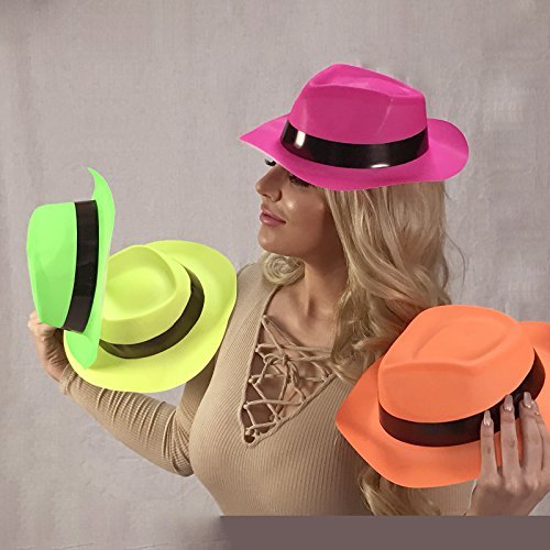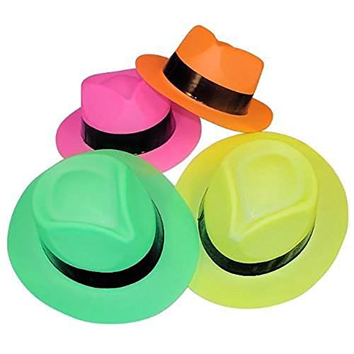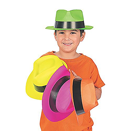 -. Binding : Toy -. Brand : Adorox -. Feature : Assorted bright neon colors: Yellow, Orange, Pink, & Green / Fedora made from a thin lightweight plastic with a Black Band / Measures Approx: 11.5" L x 4" H x 10" W / Make a great Party Favor for Both Kid and Adults / Perfect for a Rave or Halloween costume party -. IsAdultProduct : 0 -. ProductGroup : Toy -. ProductTypeName : TOYS_AND_GAMES -. Title : Adorox Neon Color Plastic Gangster Hats Fedora Party Favors