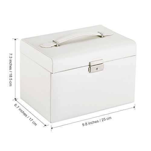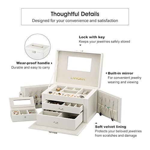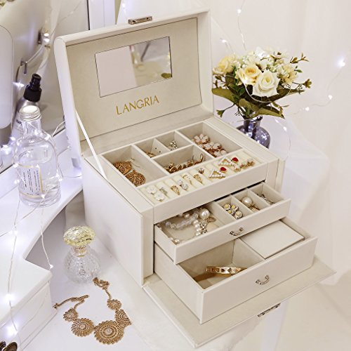 LANGRIA Jewelry Box with Lock and Mirror, Faux Leather Travel Jewelry Cases Organizer for Makeup and Jewels, with Soft Lining Interior, Anti-Scratch (White)