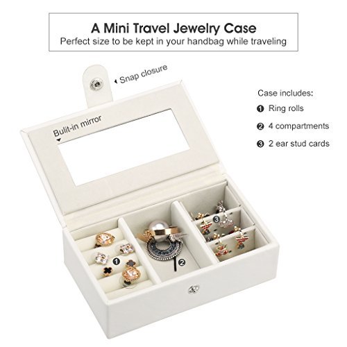 - MINI TRAVEL CASE: the jewelry box comes with a travel size mini jewelry case that can perfectly fit in your handbag; it features a snap closure, a built-in mirror, 4 compartments, 2 ear stud cards and ring rolls