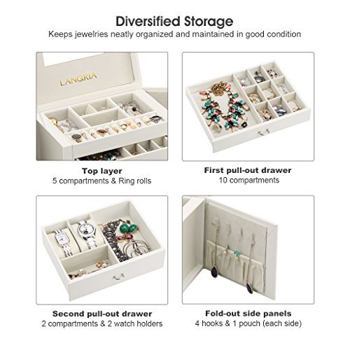 - LOTS OF SPACE: the top layer has 5 compartments, 3 ring slots and ring rolls, the first drawer has 10 compartments while the second one has 2 watch holders and 2 compartments; 2 fold out side panels have 8 necklace hooks and 2 pouches