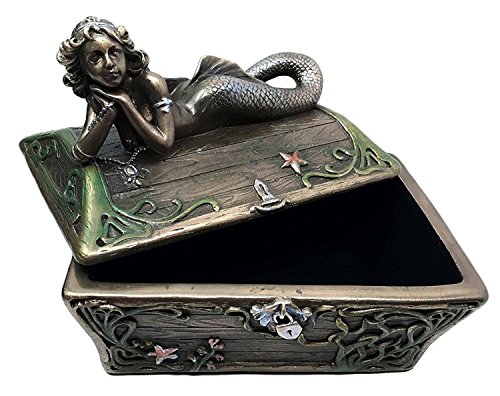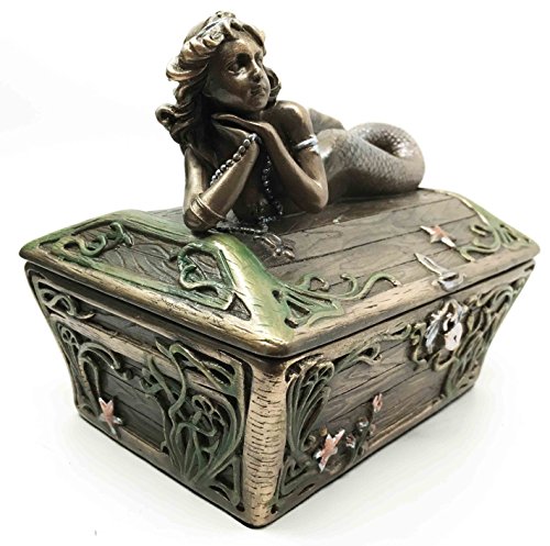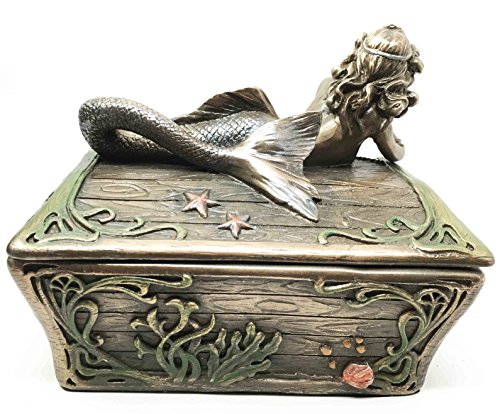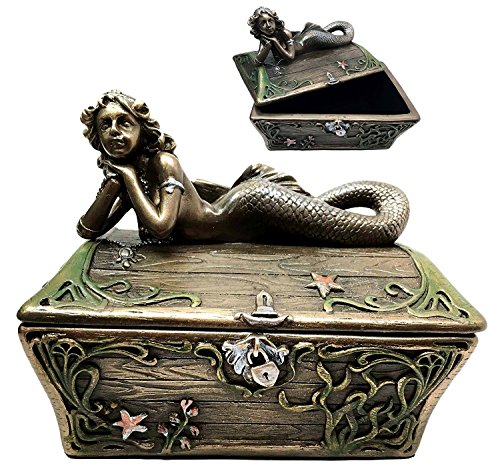 Beautiful Mermaid Resting On Sunken Treasure Chest Trinket Jewelry Box Figurine