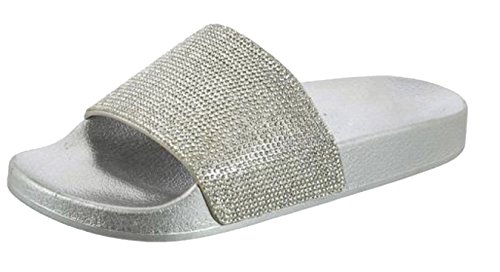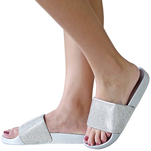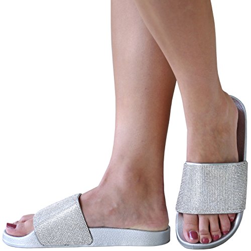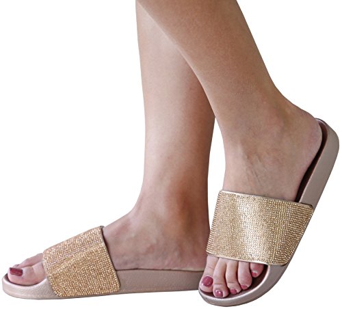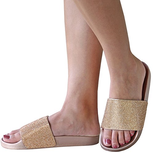TMO Women Rhinestone Single Band Open Toe Flat Sandals Slides