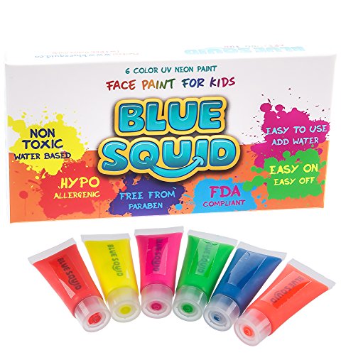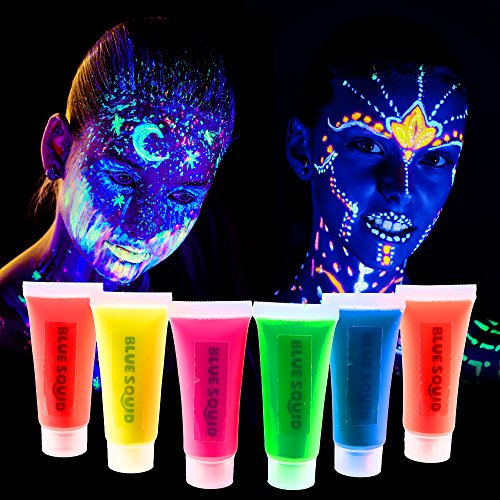 SIX GLOWING COLORS. Your Blue Squid UV Face & Body Paints come in six vibrant beautiful 10ml/0.34oz colors which glow with amazing brightness under a UV light. They're brightly colored in normal lighting but do not glow unless UV / Black Light is present.