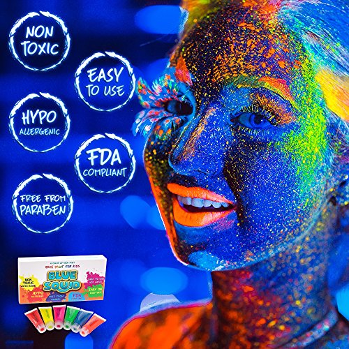 BRIGHT, VIVID COLORS: Perfect blacklight reactive face and body paints for Parties, Festivals, Clubs or Raves; anywhere that has UV lights. Dries Quickly and washes off easily with water