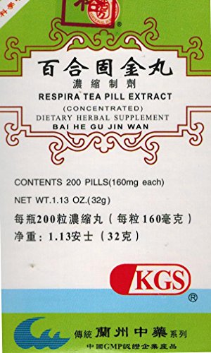 Note: Respira Tea Pill Extract is a modern preparation of the ancient prescription "Bai He Gu Jin Tang" (Lily Bulb Decoction to Preserve the Metal) originally appeared in Analytic Collection of Medicinal Formulas (Yi Fang Ji Jie). This herbal formula is commonly used for dry cough caused by Lung and Kidney Yin Deficiency. 0