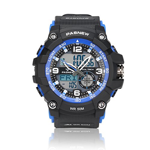 This waterproof watch with analog and digital display has a durable PU band, stainless steel back and EL backlight for the night. It is lightweight and very comfortable to wear.