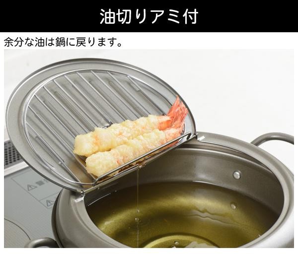 フタの裏には油切りができるアミ付。余分な油は鍋に戻る設計になっています。 |
