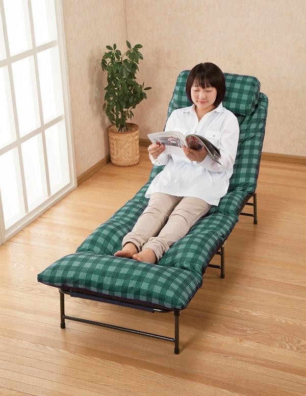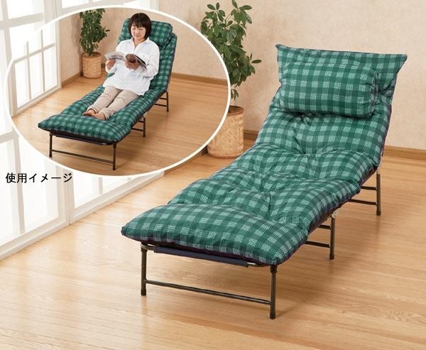 マットは取り外し可能。マットだけ外した本体はアウトドアにも最適です!!三つ折りができ、コンパクトにたためるので(幅はたったの15cm!!)、使わない時はちょっとした隙間にしまっておけます。背もたれは6段階のリクライニングだから、お好みの角度でくつろげます。べルトで留められるクッション枕付き。 |