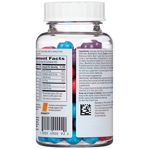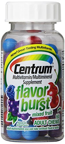 Centrum Flavor Burst Chews are a uniquely delicious, chewable adult multivitamin with an essential vitamin core. Great tasting outside and chewy inside. Centrum Flavor Burst Chews provide essential vitamins and antioxidants: B-vitamins to help support daily energy needs,* and antioxidants, Vitamins C and E, to help support the immune system*. Take when it's convenient - with or without food or water.Feature