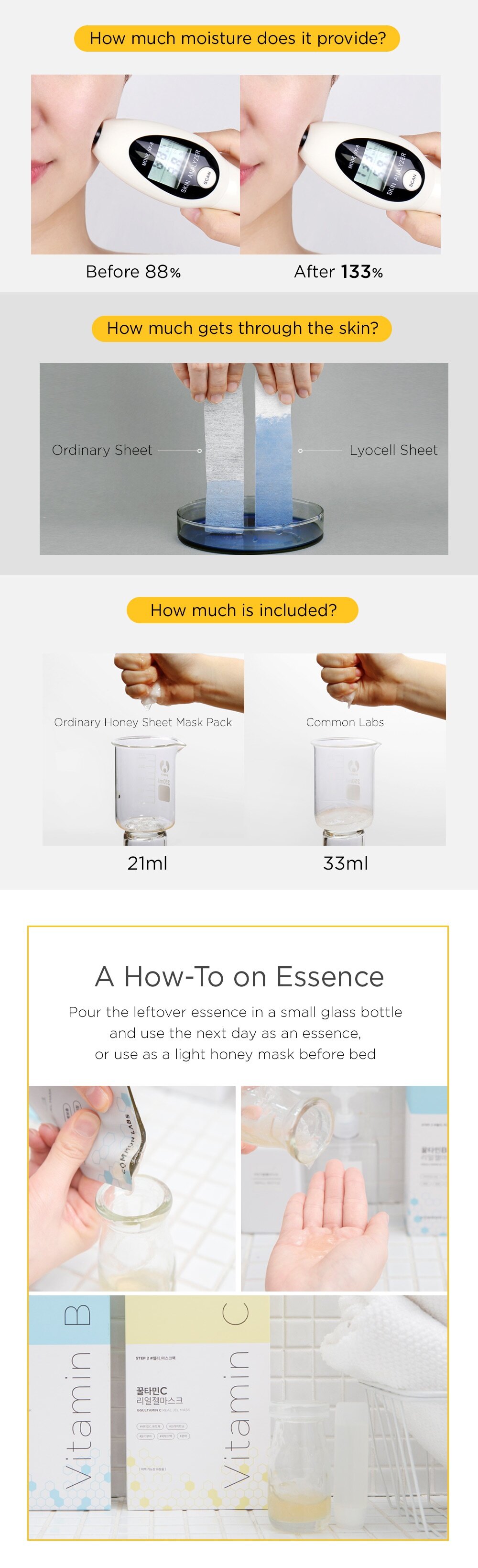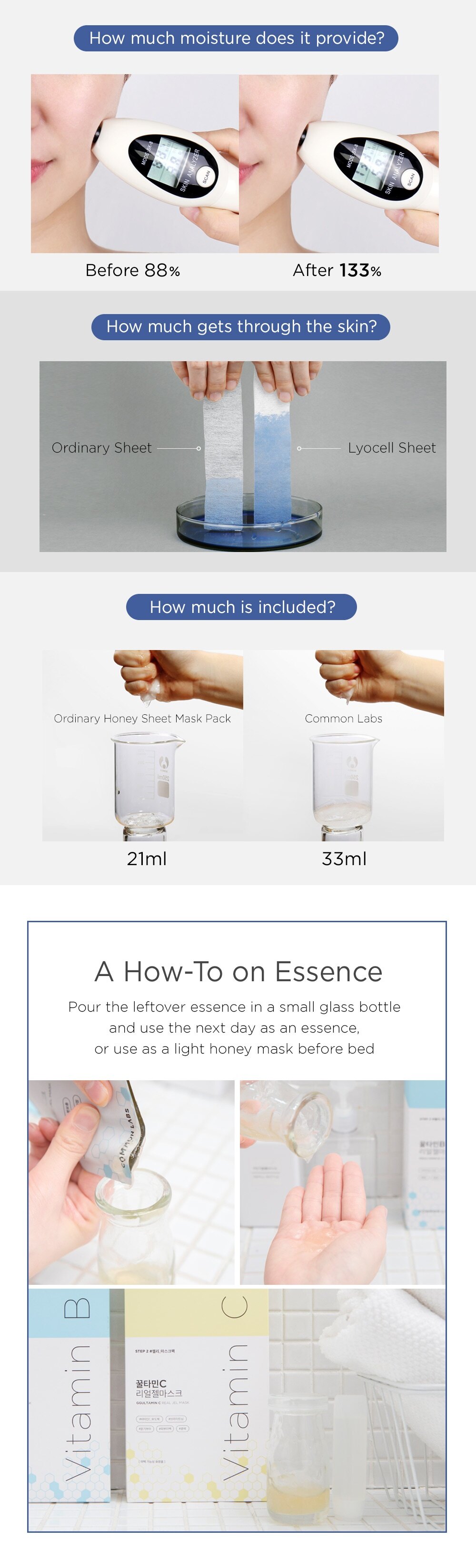 The leftover essence in the package can be poured in a separate container and can be used the next day as an essence or used as a light honey mask before bed.