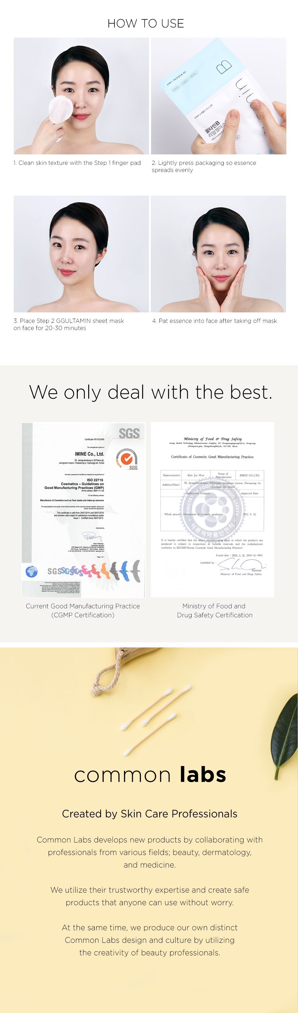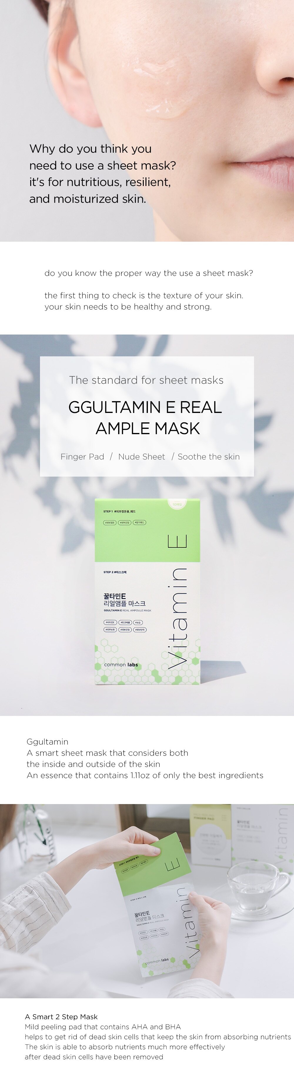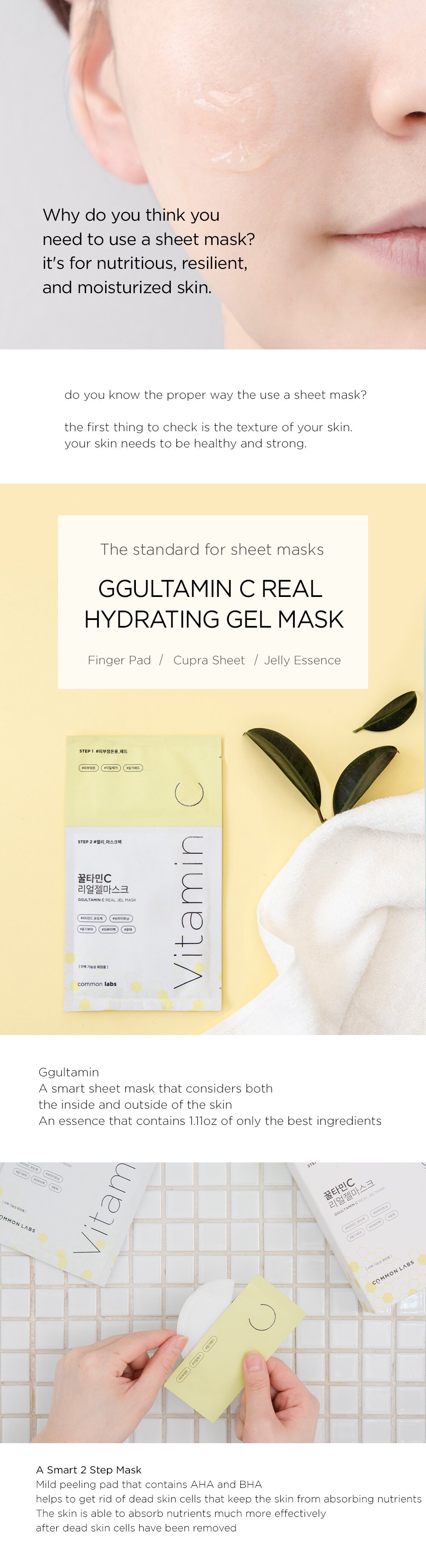 Cleanse face. Smoothe out skin texture with Step 1 finger pad. Lightly press package before opening to evenly spread out essence. Place Step 2 GGULTAMIN sheet mask on face for 20~30 minutes. Pat essence into face after taking off mask.