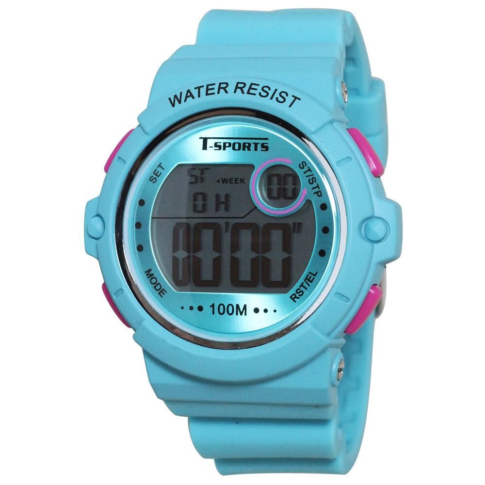 アラームやカウントダウンなどの機能が付いたデジタル表示の腕時計。