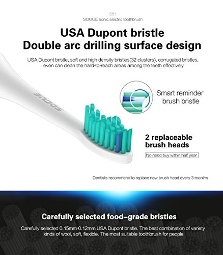 - USA Dupont bristle, smart reminder brush bristle(the brush color will change when it’s time to replace), soft and high density bristles (32 clusters), corrugated bristles could clean the hard-to-reach areas among the teeth effectively.