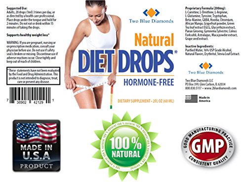 -. Binding : Health and Beauty -. Brand : Two Blue Diamonds -. Color : Clear -. Feature : All Natural / Hormone Free / Made in USA / Proven Results / 21 Active Ingredients (Each w/ Specific Purpose) / Great Sweet Stevia Taste / 45 Day Supply / Diet & Recipe Guide Available Upon Request -. IsAdultProduct : 0 -. Label : Two Blue Diamonds LCC -. LegalDisclaimer : These statements have not been evaluated by the Food and Drug Administration. This product is not intended to diagnose, cure any disease. -. Manufacturer : Two Blue Diamonds LCC -. MPN : 2BDDDF1 -. PackageQuantity : 1 -. PartNumber : 2BDDDF1 -. ProductGroup : Health and Beauty -. ProductTypeName : HEALTH_PERSONAL_CARE -. Publisher : Two Blue Diamonds LCC -. Size : 2oz / 60ml -. Studio : Two Blue Diamonds LCC -. Title : Most Potent All Natural Diet Weight Loss Drops on the Market 21 Ingredient Appetite Suppressant Lose Weight Fast Up To 45 Day Supply