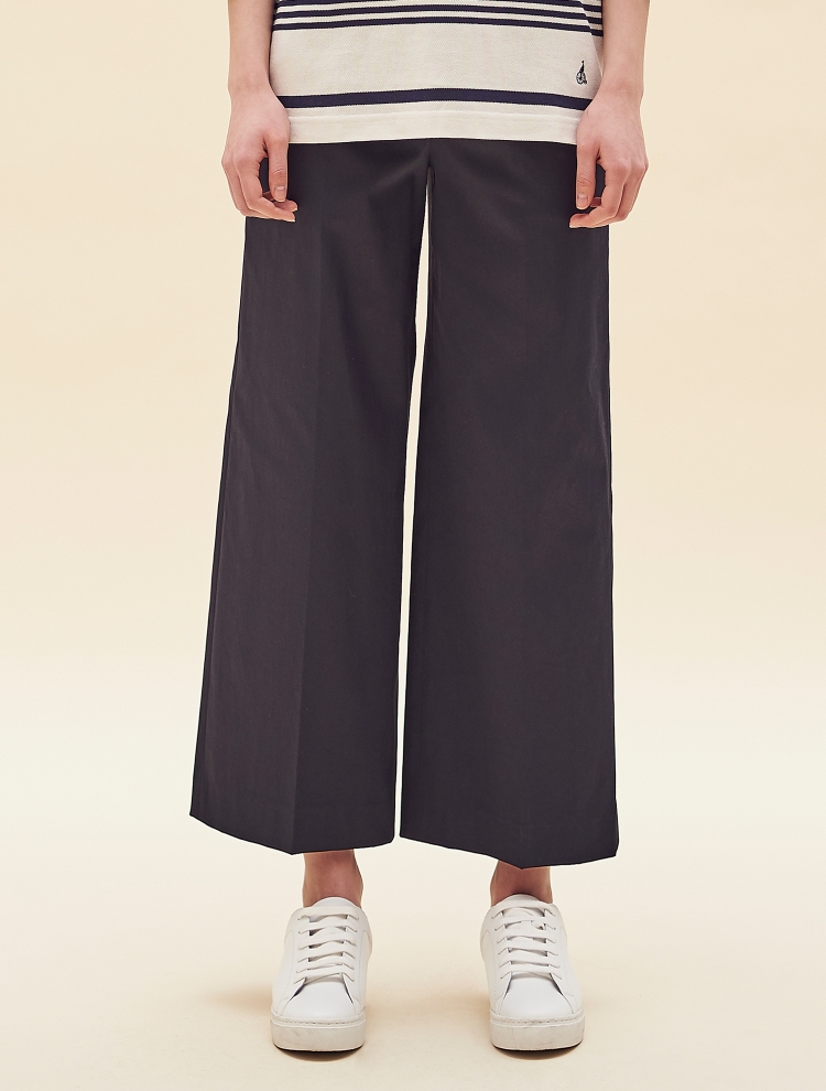 - 시원한 폴리 소재의 와이드 팬츠로 웨이스트 부분 제원단 배색으로 깔끔하고 세련된 스타일링이 가능한 제품입니다.