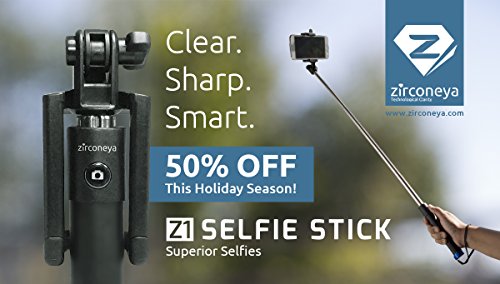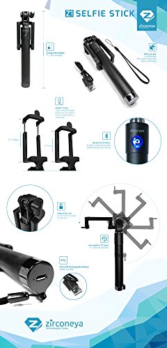 Zirconeya Selfie Stick (Z1), Compact & Extendable, Bluetooth Wireless Monopod, USB Rechargeable, For iOS & Android phones, iPhone 5/6/6S/6S Plus, Samsung Galaxy S5/S6/S7, Note 3/4/5/Edge [BLACK]