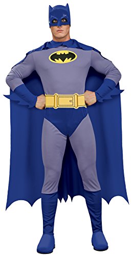 -. Binding : Apparel -. Brand : Rubie's -. ClothingSize : Small 36-38, Medium 38-40, Large 42-44, XL 46-48 -. Color : Blue / Green / Gray -. Department : mens -. Feature : Jumpsuit with attached boot tops, cape, and belt / Headpiece/Mask included / Costumes are sized differently than apparel, consult the Rubie's size chart and reviews before selecting your size / Officially licensed The Brave and The Bold costume, buy with confidence direct from Amazon, a trademark of DC Comics / Rubie's offers licensed DC Comics character costumes and accessories in sizes and styles for the entire family -. Genre : Superheroes/Villains -. IsAdultProduct : 0 -. Label : Rubies Costumes - Apparel -. Manufacturer : Rubies Costumes - Apparel -. MPN : RC889053 -. NumberOfItems : 1 -. PackageQuantity : 1 -. PartNumber : RC889053 -. ProductGroup : Apparel -. ProductTypeName : ADULT_COSTUME -. Publisher : Rubies Costumes - Apparel -. Size : X-Large -. Studio : Rubies Costumes - Apparel -. Title : Men's Batman The Brave and The Bold Adult Batman Costume, Blue/Grey, Large