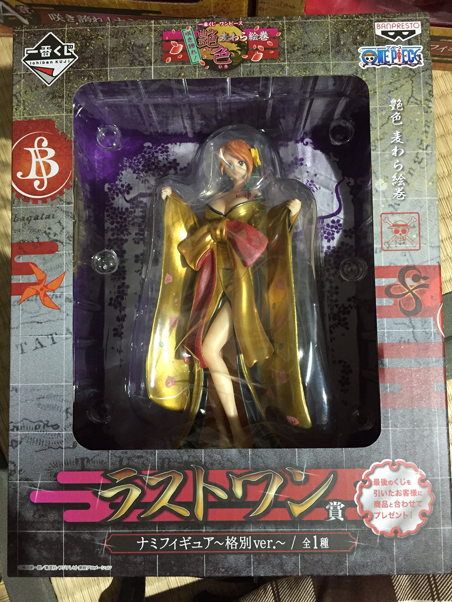 Line up item of 'Straw Hat of the Straw' wrapped in a Japanese style costume of original design Take a glossy pose with a kimono in a dazzling expression "Blooming! Nami Figure" Overall height about 19 cm "Last one Award "was painted with golden A prize" Nami figure ~ Special ver. ~ ". A prize is a black kimono figure in the hand. It is a product I want together with A prize. It is a dish that makes you look glamorous.