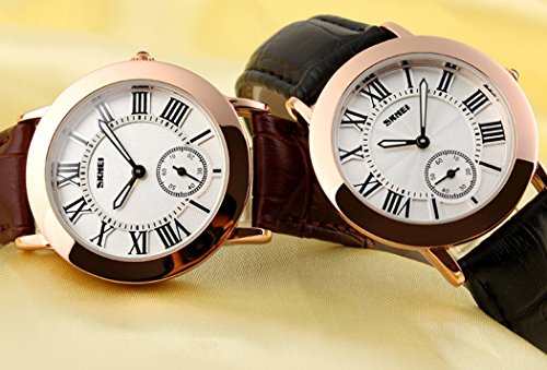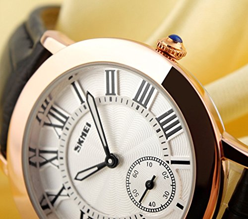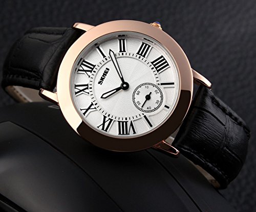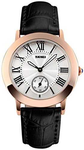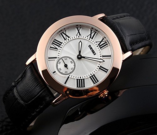 -. Binding : Watch -. Brand : Fanmis -. Department : Womens -. Feature : Japanese quartz movement with analog display. / Round watch with easy-to-read oversized roman number hour markers on dial / Leather band with contrast stitching and buckle closure / Luxury classic design watch,perfect gift for women / Water resistant to 99 feet (30 M): withstands rain and splashes of water, but not showering or submersion -. Label : Fanmis -. Manufacturer : Fanmis -. Model : SK1083B -. MPN : SK1083B -. PackageQuantity : 1 -. PartNumber : SK1083B -. ProductGroup : Watch -. ProductTypeName : WATCH -. Publisher : Fanmis -. Studio : Fanmis -. Title : Fanmis Womens Unique Roman Numeral Quartz Analog Waterproof Black Leather Strap Rose Gold Wrist Watch