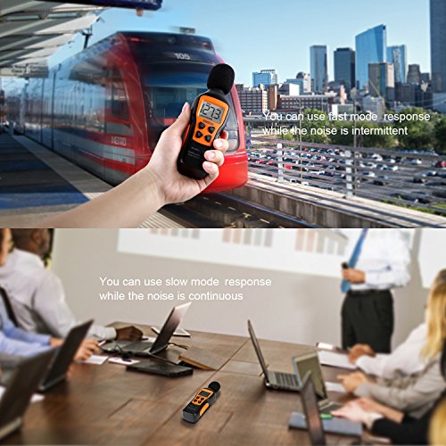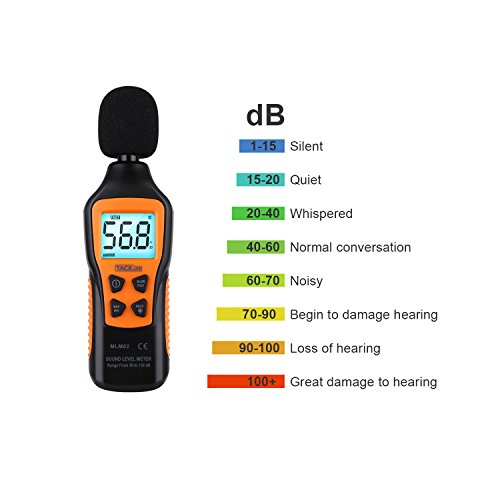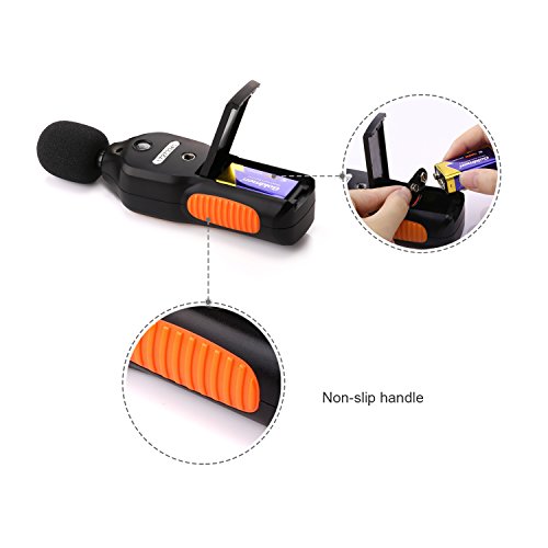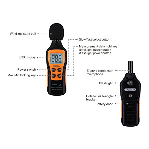 - ▲ LCD Backlight Display and LED Flashlight Added - This sound meter provides clear and easy reading even in the dark ; The flashlight on the back of the sound meter helps you take a look at the situation where you are when testing, and find the noise source if needed