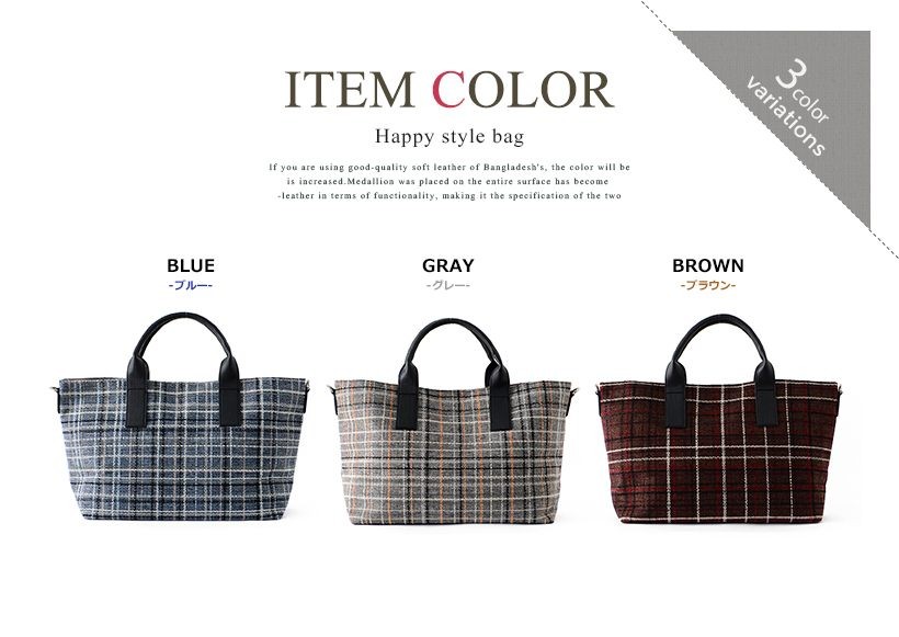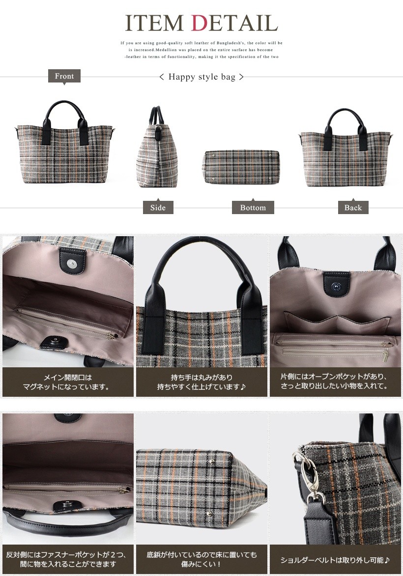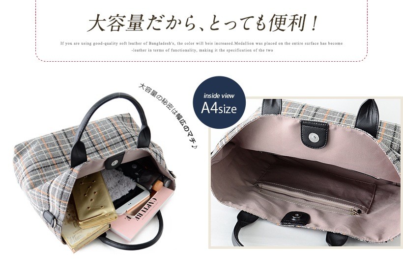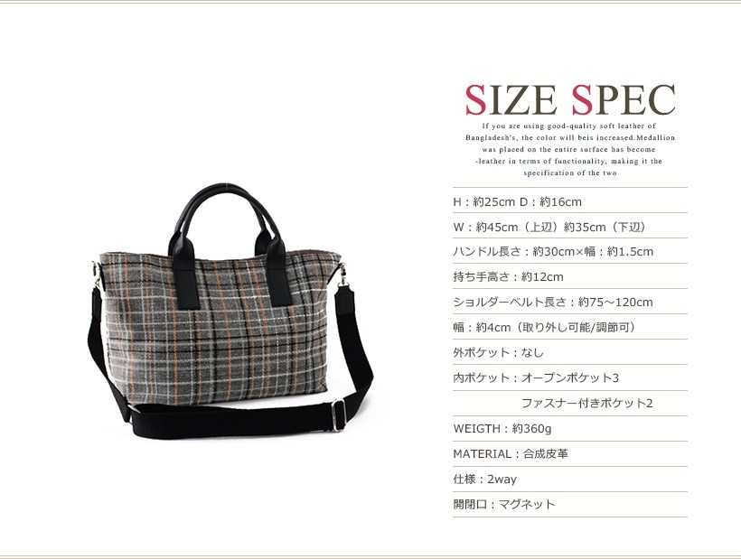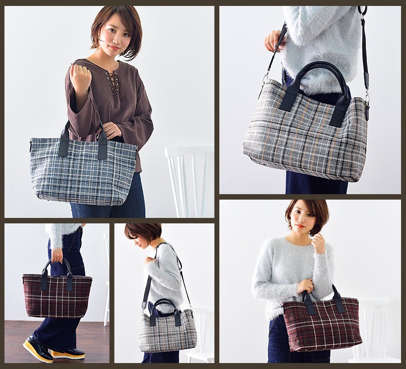 チェック柄がポイントのトートバッグ。シンプルの中に上品さを持ち合わせた季節感を感じさせないデザインです。しっかりとマチがあり、必需品の収納が可能な普段使いにも最適なサイズ感。通勤・通学シーンでも使えるようにシンプルなデザインながら、しっかりと実用性は備えてあります。付属のショルダーはトレンド感のある太ベルトで、斜めがけも可能なので荷物が多いときにも便利!ショルダーにした時の、くったりとしたフォルムも魅力的です。●SIZE:高さ:約25cm / 幅:約45cm(上辺)約35cm(下辺)/ マチ:約16cm●ハンドル長さ:約30cm×幅:約1.5cm、持ち手高さ:約12cm●ショルダーベルト長さ:約75~120cm×幅:約4cm(取り外し可能/調節可) ●外ポケット:なし●内ポケット:オープンポケット3、ファスナー付きポケット2●重さ:約360g●素材:合成皮革●仕様:2way●バッグのメイン開閉口はマグネットになっております。[カラー]ブルー・ブラウン・グレーメーカーより取り寄せ商品のため、在庫状況によっては欠品・廃盤の可能性があります。あらかじめご了承ください。