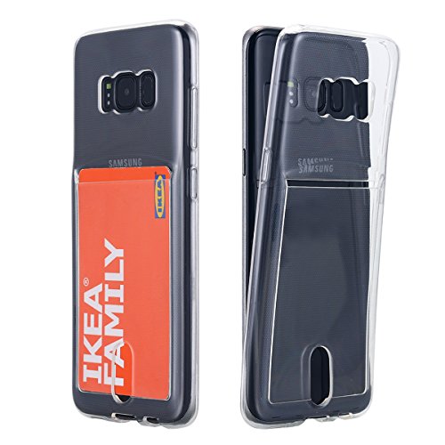 -. Feature : Ultra thin card slot case is stylish and slim keeping cards secure. Transparent soft and flexible case keeps phone protected with the convenience of a card holder case. / Comfortable grip and rubbery feel prevents phone from sliding. Case absorbs shock and isolates vibration through the TPU. / Buttons, ports, cameras, mics, and speakers easily accessible & precisely cutout. Made of high quality TPU. Front face edges has partial non slip rubbery grip. / Holds 1 card securely but can stretch to very tighly fit 2 cards. / This case fits the Samsung Galaxy S8 Plus AT&T, T-Mobile, Verizon, SP.R.Int & International.