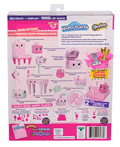 -. Binding : Toy -. Brand : Shopkins -. Color : Multi Color -. EAN : 0630996564769 -. Feature : The Decorator's pack contains: 3 medium Petkins, 8 small Petkins, 4 Mini Petkins, 2 tiles and a catalog. So many things to help you add those finishing touches to a room! There are 1000s of ways to decorate and play! / So many things to help you add those finishing touches to a room! -. IsAdultProduct : 0 -. Label : Moose Toys Import -. Manufacturer : Moose Toys Import -. Model : 56476 -. MPN : 56476 -. NumberOfItems : 1 -. PackageQuantity : 1 -. PartNumber : 56476 -. ProductGroup : Toy -. ProductTypeName : TOYS_AND_GAMES -. Publisher : Moose Toys Import -. ReleaseDate : 2017-11-01 -. Size : 1.77'' x 7.87'' x 9.84'' -. Studio : Moose Toys Import -. Title : Happy Places Shopkins Season 3 Decorator Pack - Prom Night Princess -. UPC : 630996564769 -. Warranty : No Warranty