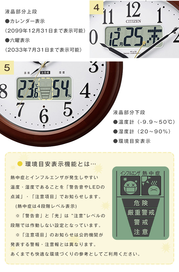 ●カレンダー、六曜、温度、湿度、注意報表示もあり機能充実!