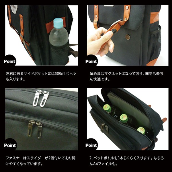 避難用品は、目立つロゴ入りリュックで!カラフルでおしゃれ!大容量!2Lペットボトルが3本らくらく入るリュックです。 A4ファイルももちろん入ります。左右にあるサイドのメッシュポケットには500mlペットボトルも入ります。かぶせ部分の留め具はマグネット式になっているため開閉楽々です。カバンのファスナーにはスライダーが2個付いており、こちらも開けやすくなっています。カバンには外ポケットがあり、すぐに取り出したい小物を入れておけます。中は仕切りが付いており、整理に役立ちます。ロゴ部分は反射素材で夜間でも安心です。■商品サイズ:(約)幅29×高さ37×マチ10cm