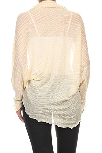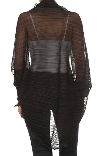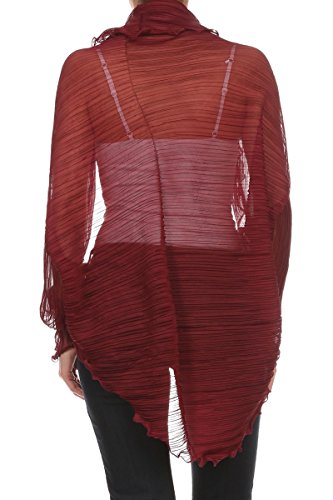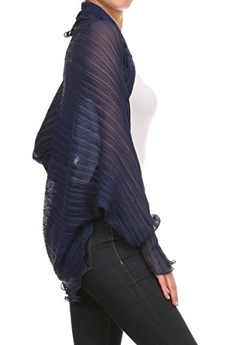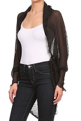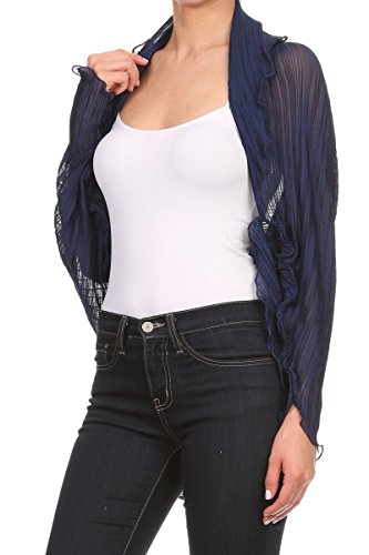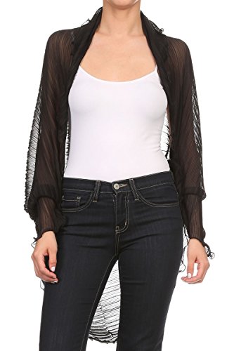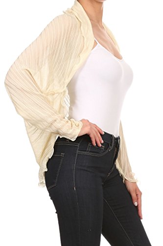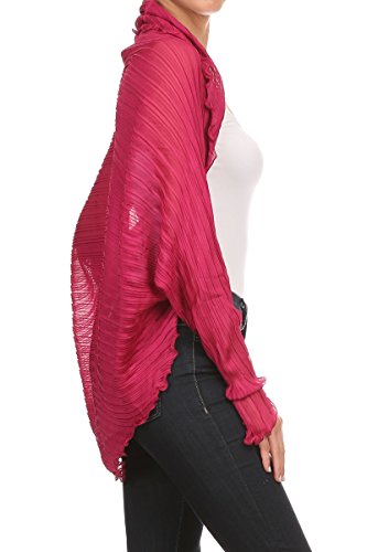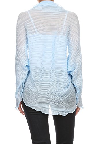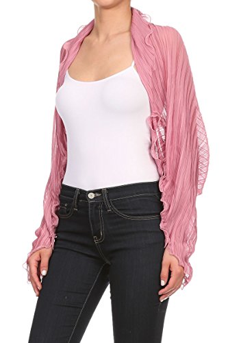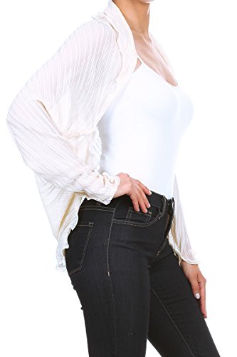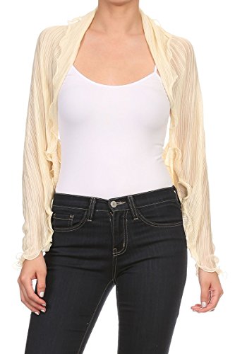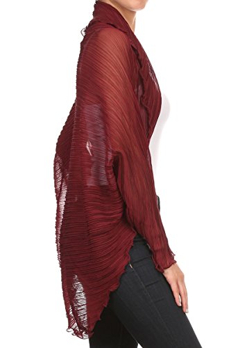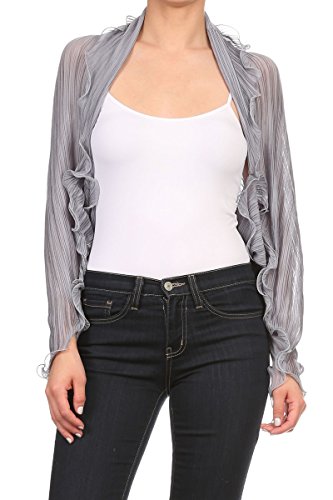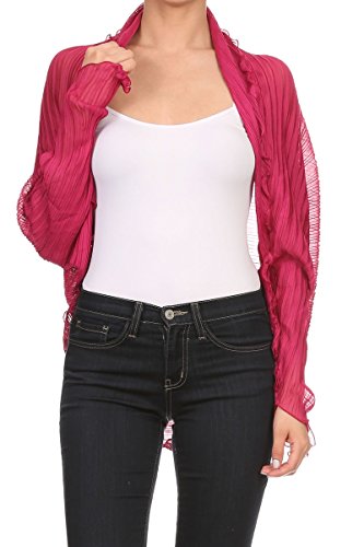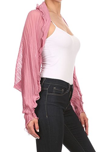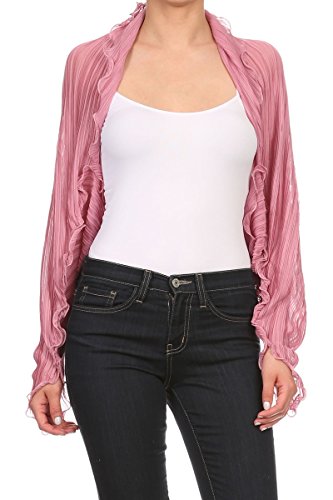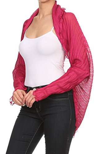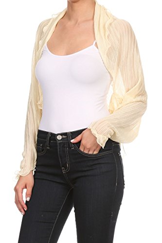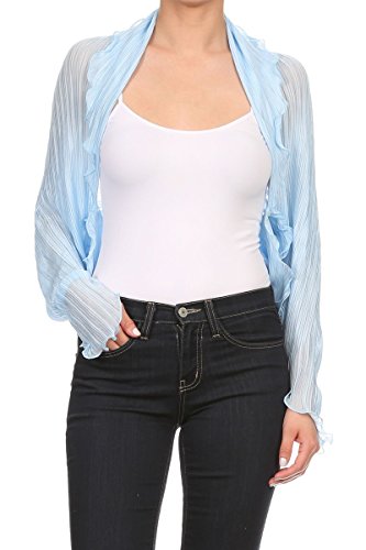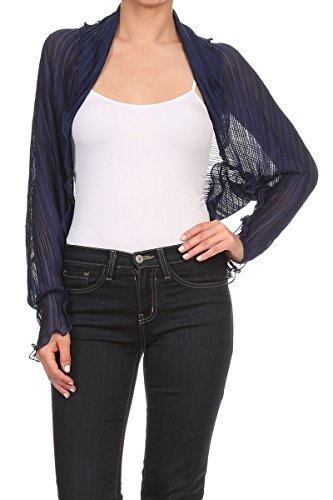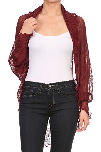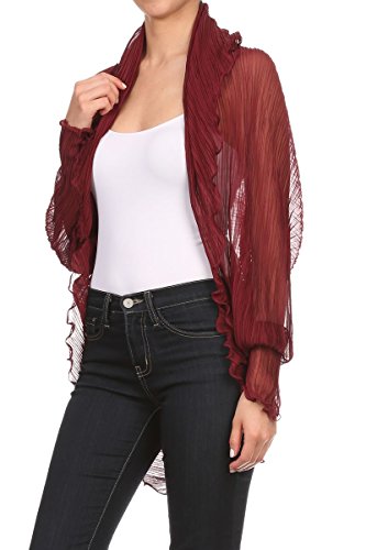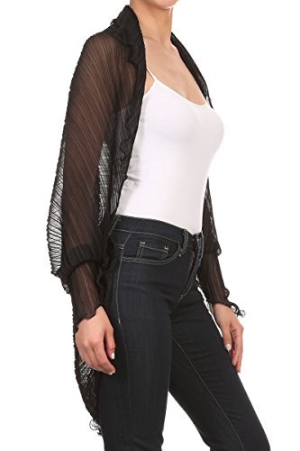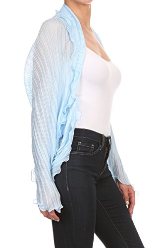 Binding : Apparel Product Description Pleated chiffon long sleeve coverup with shawl neckline, lettuce edge, rich with texture and fine details to create a lovely shrug inspired cover up that can be worn on many occasions all year round. Open front layer that is comfortable and lightweight in nature and designed to add color and elegance to your outfit. We love this top as an evening jacket to add style to your going out outfit or dress- whether it's girls' night out, cocktails, wedding or a party; during the day as an additional layer, styled as a jacket or cardigan; around the pool or beach as a bathing suit cover up. The possibilities are endless. This versatile fashion accessory will be the go to item in your wardrobe. Create your individual look and show us a picture! Model is 5 foot 6-7 inches and normally wears a small. Measures 32 inches from neck to bottom hem; 60 inches from sleeve cuff to sleeve cuff If you have any concerns with this item, please contact us at Accessory Necessary on Amazon right away so that we can figure out a way to make you happy. What are you luxing for? Please note, colors may appear different than on screen due to screen monitor settings and dye lots. Quality can only be guaranteed when bought through Accessory Necessary, NYC seller 0