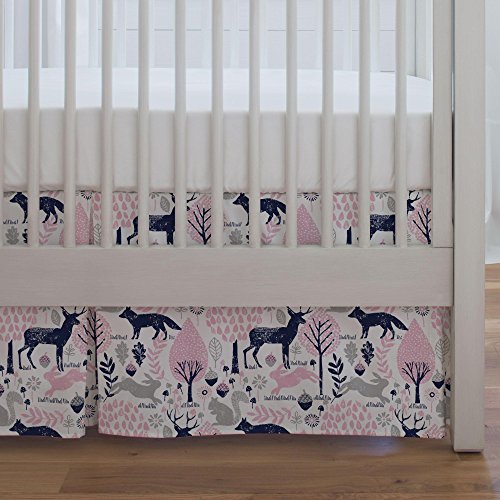 Product Description Bubblegum Pink and Navy Woodland Animals crib skirt. Get your crib picture perfect with our single-pleat crib skirt. Finished length approximately 16-17 inches. Fits standard cribs using mattresses measuring approximately 28" x 52". Dry clean only. 0