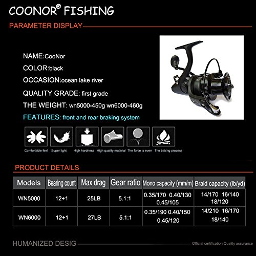 -. Feature : GREAT VALUE -Military-industrial high strength materials body make the Spinning Reel more light, powerful.Excellent line lay oscillation system. Ultra-thin streamline designed body. / PERFORMANCE - 12+ 1 Corrosion resistant deep-race smooth ball bearings, instant stop anti-reverse, Interchangeable Right Or Left Hand CNC machined aluminum handle and exquisite aluminum spool. / HIGH POWERED - Centron spinning reel's Superior Drag System offers incredible stopping power up to 27LBs/12Kg. It has a hardened metal main shaft, perfect mesh drive gear and precision machined pinion gear for fish fighting power. / LOOKING GOOD - Flawless light weight graphite spinning reel body with rich black finish is corrosion proof. / SUITABLE POSITION- Ocean boat fishing, ocean rock fishing, ocean beach fishing, lake, river, reservoir pond, stream