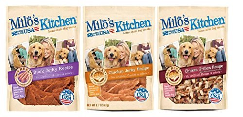 -. Title : Milo's Kitchen Home-Style Dog Treats 3 Flavor Variety Bundle: (1) Duck Jerky Recipe, (1) Chicken Grillers Recipe With Natural Smoke Flavor, and (1) Chicken Jerky Recipe, 2.7 Oz. Ea. (3 Bags Total)