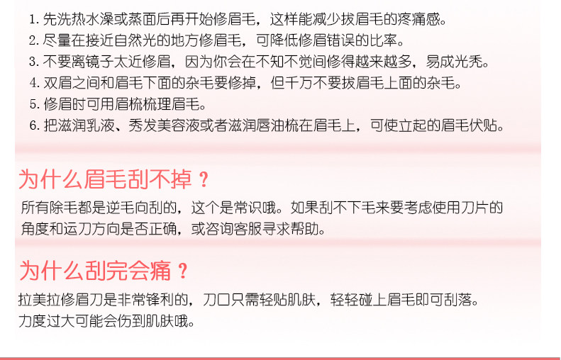 | 使用说明: | ? 特点:它能帮助修储多余的眉毛,轻轻不留痕迹,刀头小巧易于掌握,能有效修整你的美眉,带有防护网,觉不会弄伤你的娇嫩的肌肤。? 使用说明:先将乳液及其他润滑剂涂滑在欲剃的部位,再使用本产品,使用后请用软布擦拭干净,中性洗涤剂清洗,并保持本品干燥,本品锋利度高,请勿太大力与肌肤接触,对镜使用。 注意事项:请勿置于小孩触及处,用完后请用清水冲洗干净,并置于干燥通风处。? | |
