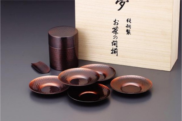 お茶本来のおいしさを引き出す銅の茶器です。茶筒には中蓋が付いており、湿気を防ぎ、お茶の風味を損ないません。