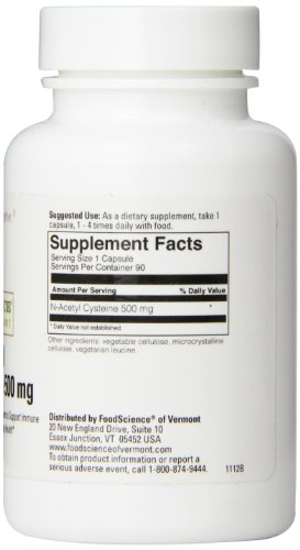 -. Binding : Health and Beauty -. Brand : FoodScience of Vermont -. Department : Nutritional Supplements -. EAN : 0026664329097 -. Feature : An amino acid supplement to support immune system function and lung health / Supports the body's ability to clear mucus by rupturing mucus disulfide bonds / Helps the body cope with oxidative stress which supports immune cells within the body -. IsAdultProduct : 0 -. IsAutographed : 0 -. IsMemorabilia : 0 -. Label : Food Science of Vermont -. LegalDisclaimer : * These statements have not been evaluated by the Food and Drug Administration. This product is not intended to diagnose, treat, cure or prevent any disease. ** Always refer to the manufacturer's label on the product for description, recommended dose and precautions. -. Manufacturer : Food Science of Vermont -. Model : 0300290060 -. MPN : FS-AA0089 -. NumberOfItems : 1 -. PackageQuantity : 1 -. PartNumber : FS-AA0089 -. ProductGroup : Health and Beauty -. ProductTypeName : HEALTH_PERSONAL_CARE -. PublicationDate : 2012-10-01 -. Publisher : Food Science of Vermont -. Size : 90 Caps -. Studio : Food Science of Vermont -. Title : N-Acetyl Cysteine 500mg 90caps -. UPC : 026664329097